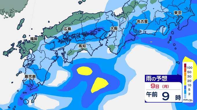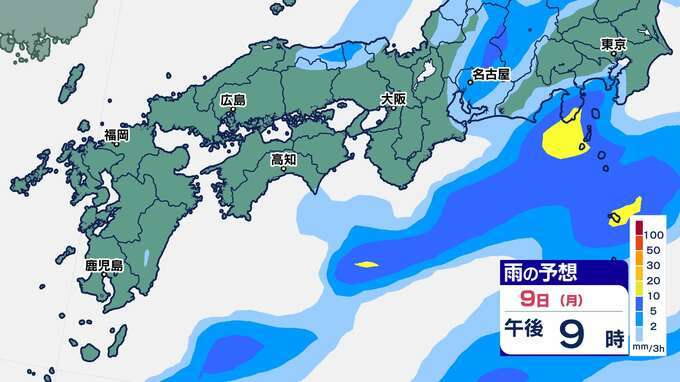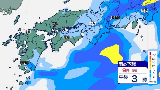 7日(土)九州から雨が降り出し、雨のエリアは徐々に東へ移動します。9日(月・祝)は雨の中心は関東地方となる見込みです。