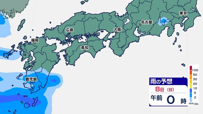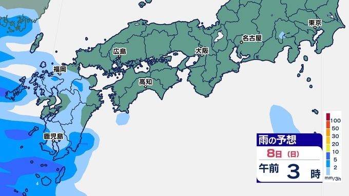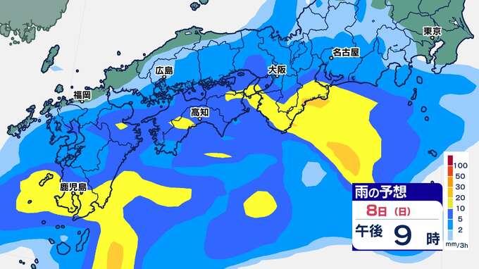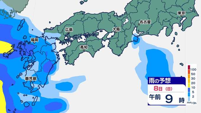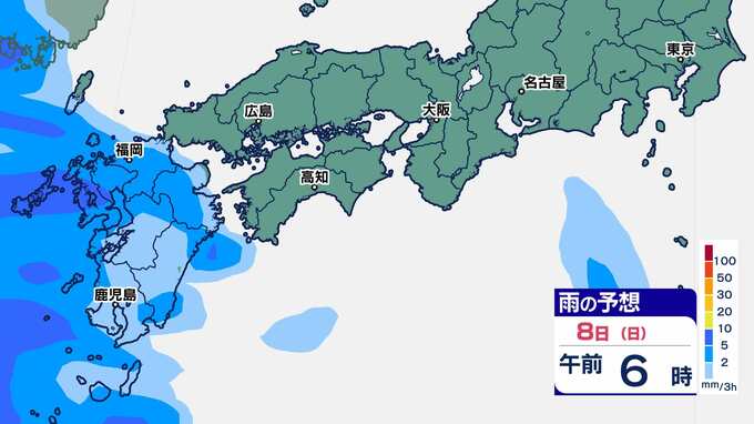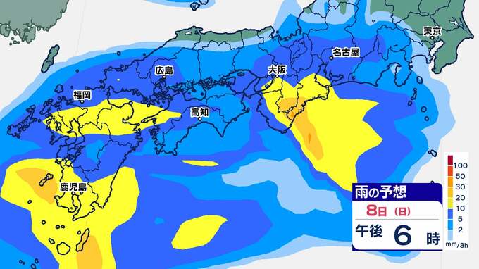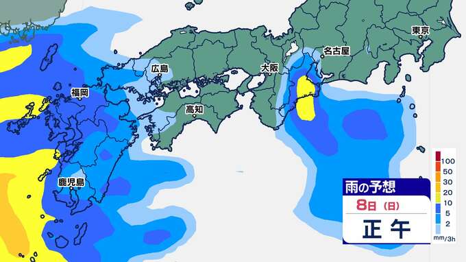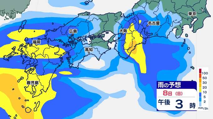 8(日)予想天気図では、前線上に低気圧が発生し、低気圧は9日(月・祝)にかけて、九州の南岸を進む予想です。雨シミュレーションでは、8日午後に九州ほぼ全域、中国地方と四国地方の広い範囲、近畿から東海にかけて発達した雨雲が予想されています。