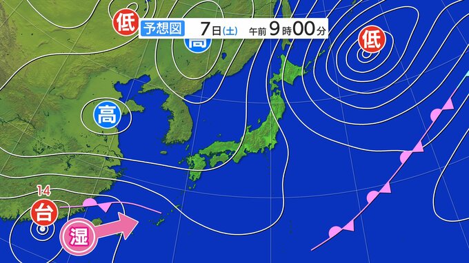 7日(土)の予想天気図では、台湾の西にある台風14号から湿った空気が流入し、秋雨前線の活動が活発するとみられます。