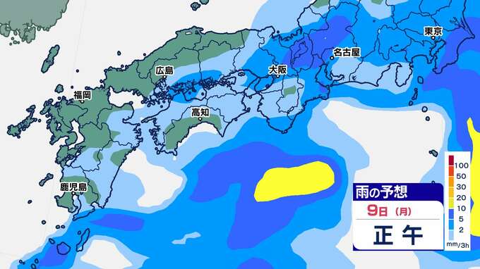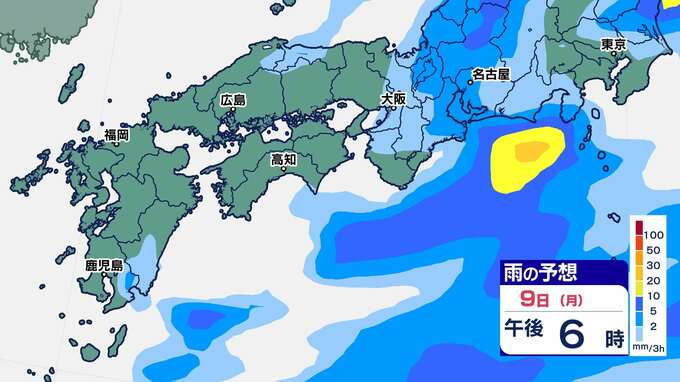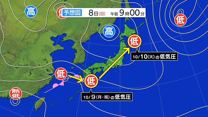 さらに低気圧は、9日(月・祝)から10(火)にかけて本州の太平洋側を進む予想で、雨の中心は関東地方となる見込みです。