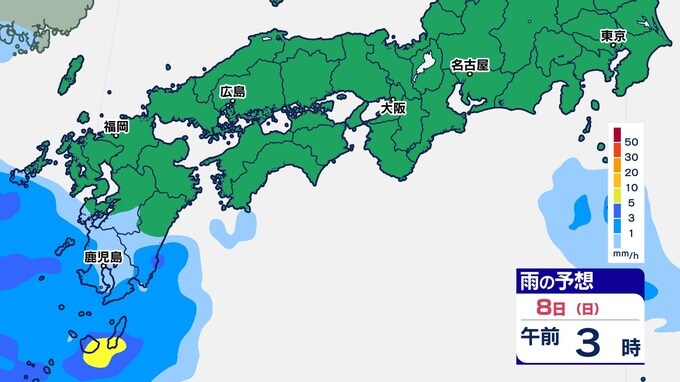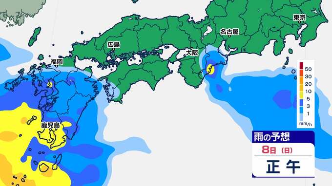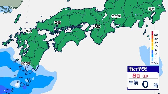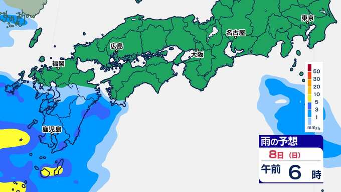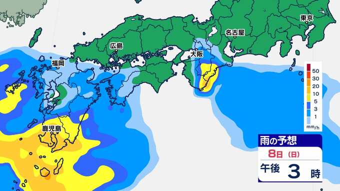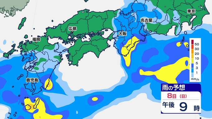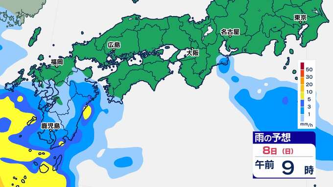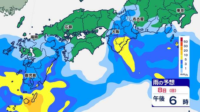 8(日)には、前線上に低気圧が発生し、低気圧は9日(月・祝)にかけて、九州の南岸を進む予想です。雨シミュレーションでは、8日午後に九州ほぼ全域、中国地方と四国地方の広い範囲、近畿から東海にかけて発達した雨雲が予想されています。