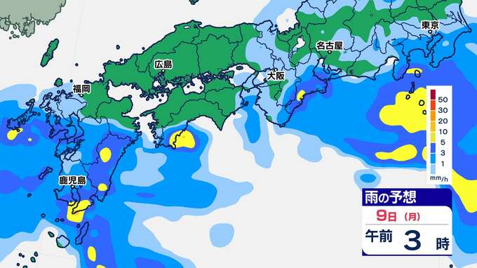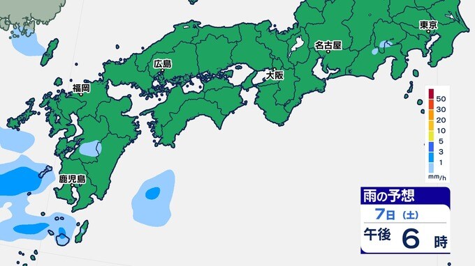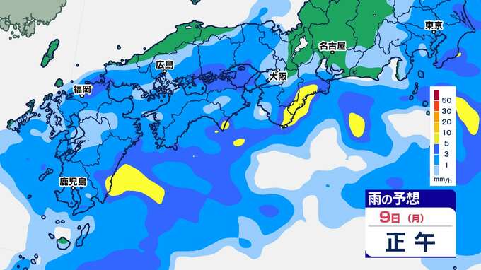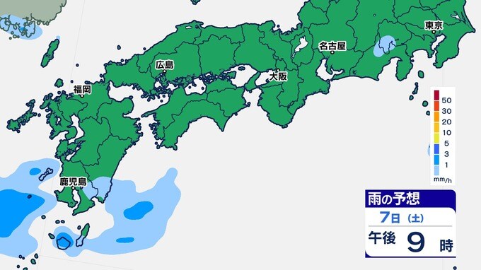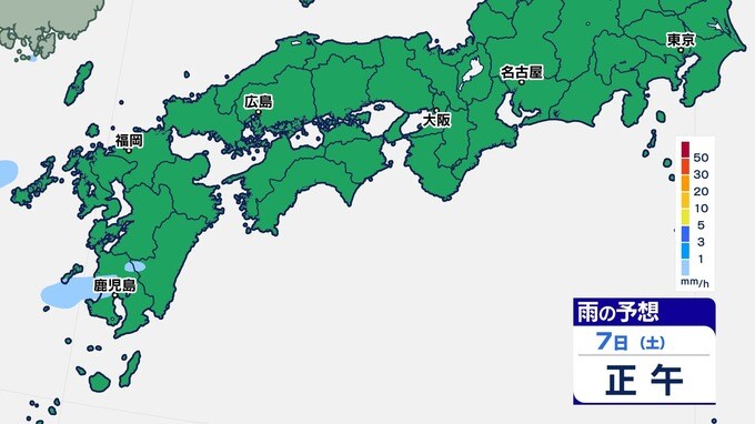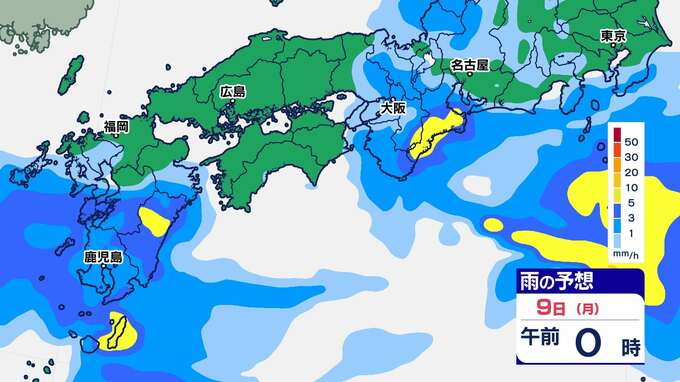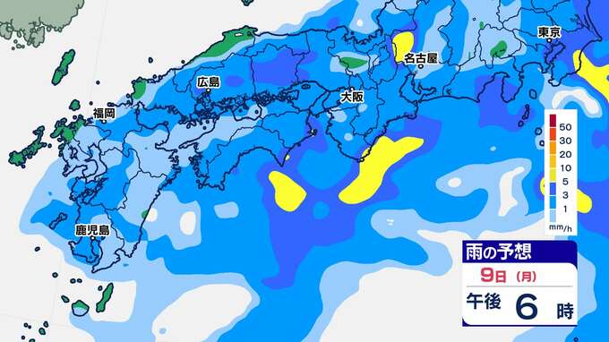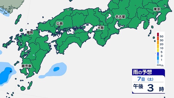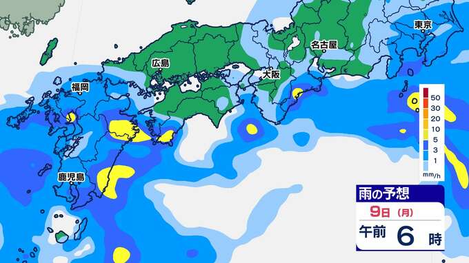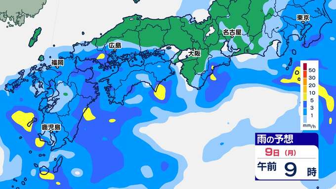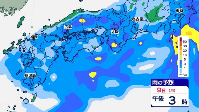 7日(土)は、九州から雨が降り出し、8日午後は九州の広い範囲が雨になりそうです。雨のエリアは徐々に東へ広がります。9日(月・祝)は、低気圧が本州の南岸を移動するため、雨の中心は関東地方となる見込みです。