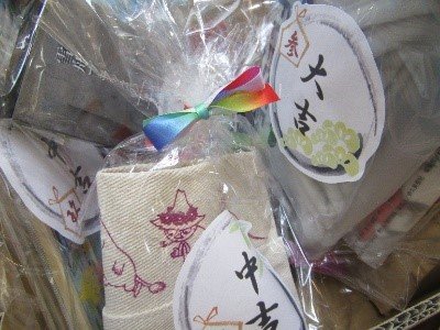 くじには「大吉」「中吉」「小吉」「末吉」があり、「大吉」は布製のトートバッグや万年筆、「中吉」は簡易な手提げ袋や小さめのポーチ、「小吉」は小さめの文具などが入っていて「はずれ」なし。
