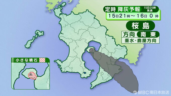 現在、桜島は噴火警戒レベル3(入山規制)です。気象台によりますと、今後、桜島で噴火が発生した場合、16日午後3時までは火口から南東の垂水市・鹿屋市方向に降灰が予想されています。