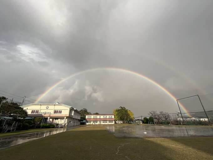 出水市高尾野町江内で撮影された一枚です。「放課後、江内中学校の校庭に大きくかかった虹に、残っていた生徒や職員みんなで歓声を上げました。」とのことです。虹に顔を輝かせる皆さんの表情が見えるようです。