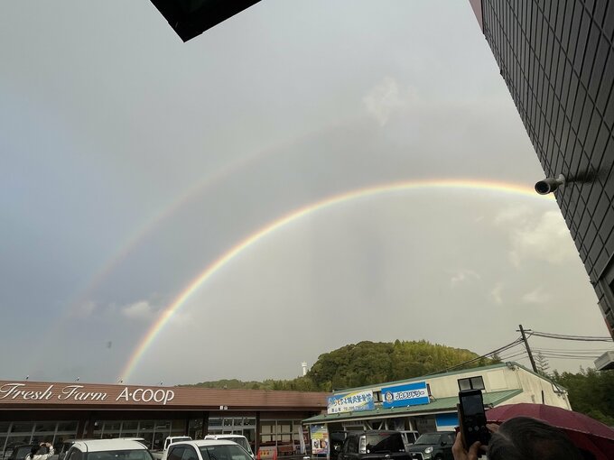 「外に出たらキレイな虹が出てました。二重に見えるのも、キレイに繋がっているのも珍しいと思い写真に撮りました」とのことです。