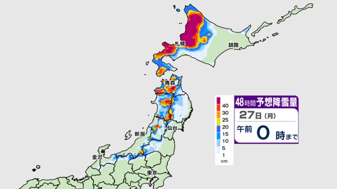 今季“最強寒波” 大雪や暴風に警戒を…マイナス36℃以下の寒気で北日本大雪おそれ【25日(土)~27日(月)大雪シミュレーション】北海道・東北・北陸は吹雪か 2023年11月25日(土) 06:12 国内 ■予想積雪量 25日(土)~27日(月) 北海道の石狩北部・空知・後志地方では、降雪量が1m近くに達する可能性があります。