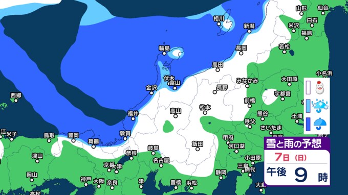 石川県、富山県、新潟県の天気は、7日は雨のち雪、8日はくもり一時雪か雨 と予想されています。