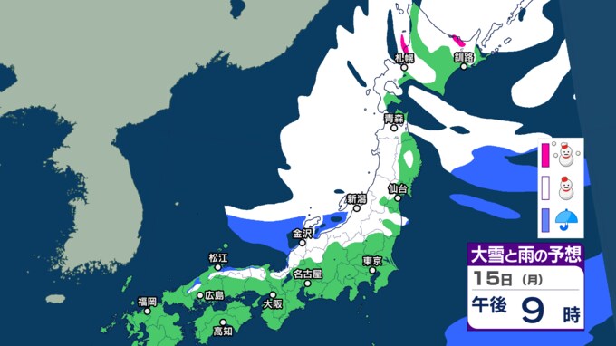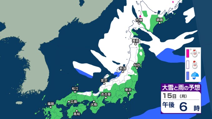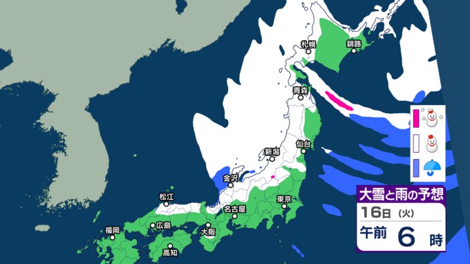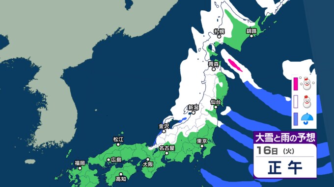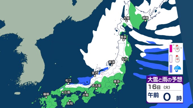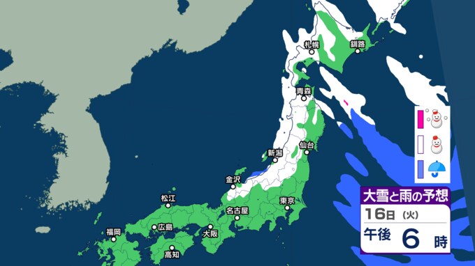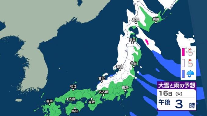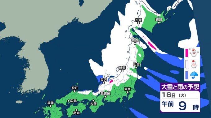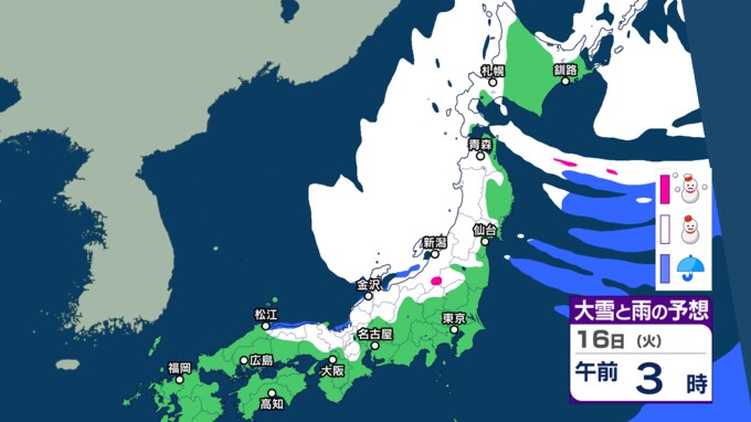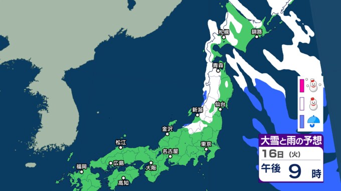北日本や東日本では、16日にかけて、大雪となる所がある見込みです。