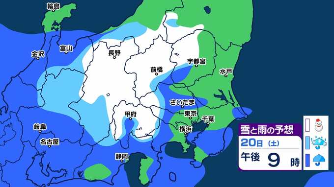 このため、関東甲信地方では、20日(土)午後は、次第に雪や雨が降りはじめ、21日(日)にかけて降り続くでしょう。