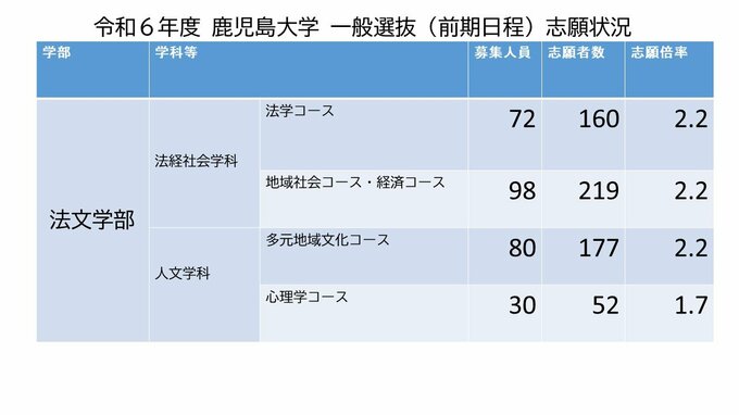 鹿児島大学の出願状況を全学部・全学科・コース等別にまとめました。