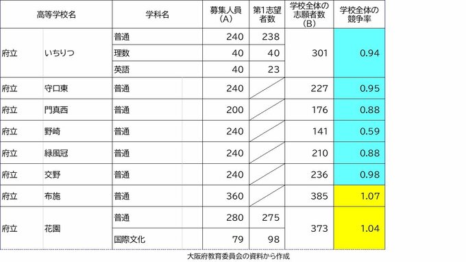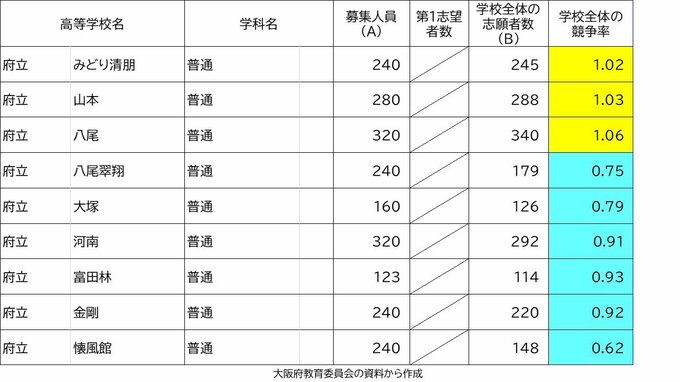 【確定値】大阪府公立高校入試2024 志願倍率は北野1.28倍 豊中1.57倍 三国丘1.47倍(令和6年度高校受験の出願締め切り 全校掲載) 2024年3月7日(木) 20:56 国内 学校別の倍率(中間値) 八尾1.06倍 布施1.07倍
