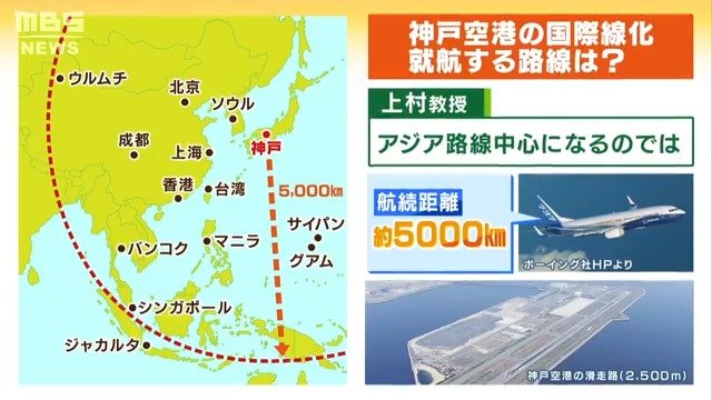 ―――では実際、どういうところに国際線が飛ぶのか?神戸から距離で言うと5000キロくらいではないかと。人気の観光地ですとグアム、シンガポール、バンコク、あたりが含まれます。