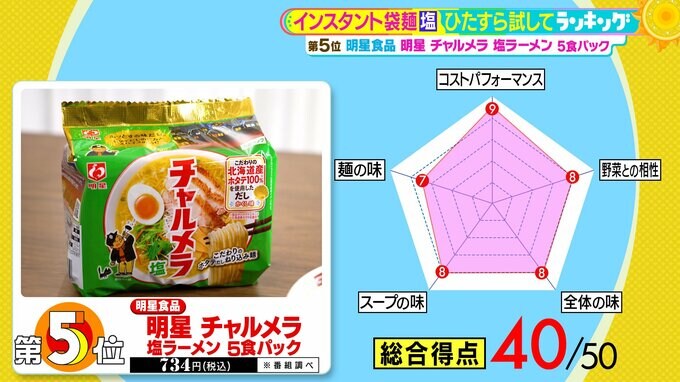5位は、明星食品の『明星 チャルメラ 塩ラーメン 5食パック』(税込734円 ※番組調べ)。