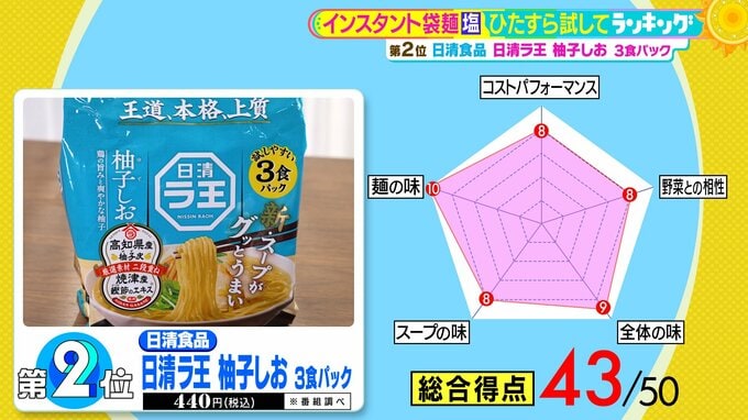 第2位は、日清食品の『日清ラ王 柚子しお 3食パック』(税込440円 ※番組調べ)。