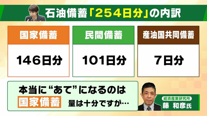 「254日分」とされている日本の備蓄量。そのうち国家備蓄が「146日分」、民間備蓄が「101日分」、産油国共同備蓄は「7日分」となっています。