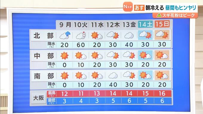 【近畿の天気】9日(月)は朝の冷え込み強い 日中は晴れるが天気下り坂 次の土日は春本番の暖かさ 2026年3月8日(日) 18:33 国内 天気 3月9日(月)の近畿地方は、朝は冷え込みが強まります。日中は晴れる所が多いですが、天気は下り坂となるでしょう。 9日(月)の午前中は、高気圧に覆われて広く晴れるでしょう。ただ、日本海を通過する低気圧…
