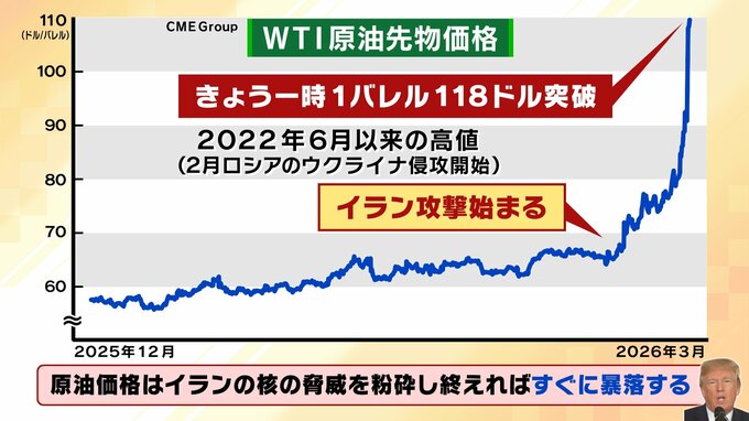 一方で、WTI原油先物価格は3月9日、一時1バレル118ドルを突破。2022年6月(ロシアのウクライナ侵攻開始から4か月後)以来の高値となっています。