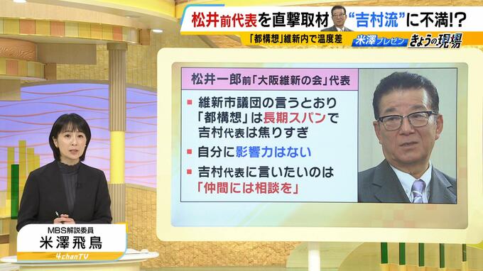 都構想の住民投票に向けた動きをめぐり、維新の内部で何が起きているのか……MBSの米澤飛鳥解説委員が、松井氏への直撃取材を交えて解説します。