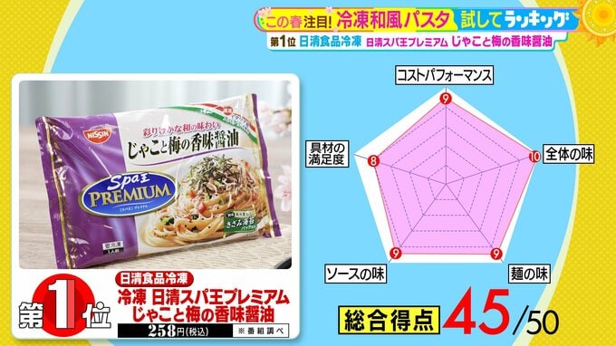 そして第1位は、日清食品冷凍の『冷凍 日清スパ王プレミアム じゃこと梅の香味醤油』(税込258円 ※番組調べ)。