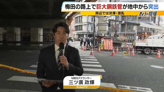 11日朝、大阪・梅田の路上で突如地中から出現した「巨大な鋼鉄管」。