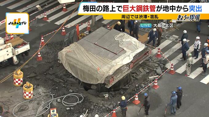 現場で取材をするMBS三ツ廣政輝アナウンサーによると、地面から突き出た金属パイプは一時、新御堂筋の高架に当たりそうな高さまで迫っていたということです。