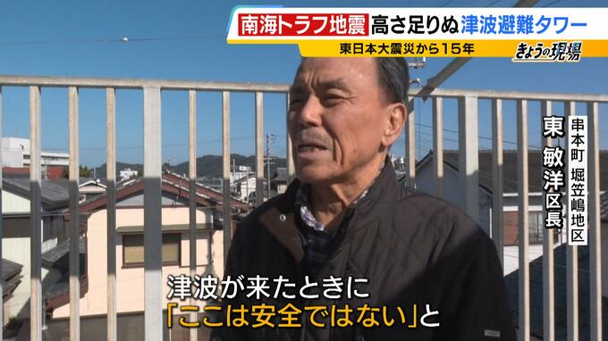 「高さ足りぬ津波避難タワー」不安抱える住民と避難の課題 命守るため『南海トラフ』の備えに奔走…和歌山・串本町の高校生と住民の取り組み【東日本大震災から15年】 2026年3月14日(土) 11:00 国内 地震・災害 津波避難タワーの高さが足りない!? 当時、この地区で想定されていた津波の高さは最大2m。このタワーの高さは5.6mとそれを大きく上回っています。 ところが… (串本町・堀笠嶋地区 東敏洋区長)「このタワーの高さが足りない。津波が来たときに『ここは安全ではない』と」