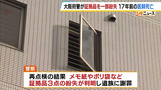 大阪府警がメモやポリ袋など証拠品の一部紛失 17年前の大阪・西成区の川で女性遺体 府警は遺族に謝罪 2026年3月12日(木) 18:08 国内 大阪府警が証拠品の一部を紛失し、遺族に謝罪しました。 2009年11月、大阪市西成区の木津川で、医師の矢島祥子さん(当時34歳)の遺体が見つかりました。 死因は溺死で、警察は当初、自殺の可能性が高い…