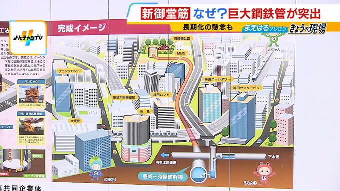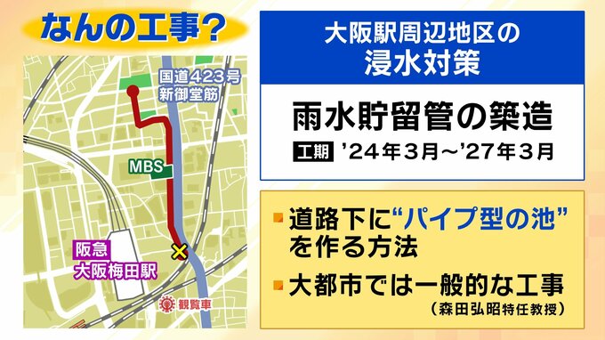 大阪・キタの中心地で起きた前代未聞の事故。大阪市建設局によると、現場周辺の地下では「雨水貯留管の築造工事」が行われていました(工期:2024年3月~2027年3月)。