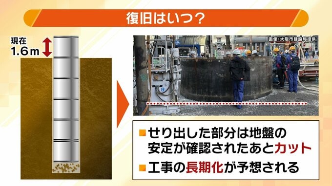 せり出した部分については、地盤の安定が確認されたあと、地面と平行になるようにカットする必要があるということですが、工事の長期化が予想されます。