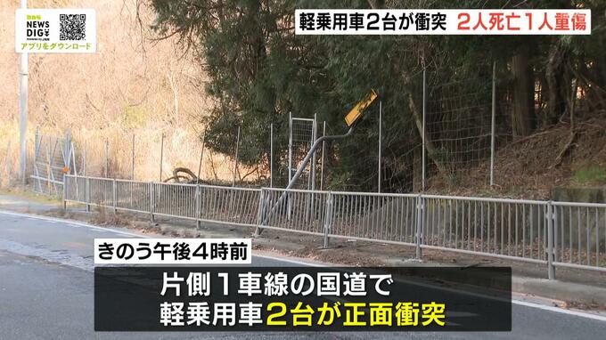 警察によりますと、現場は片側1車線の国道で、北方向へ進んでいた軽乗用車が中央線をはみ出し、南方向へ進んでいた軽乗用車に衝突したとみられるということです。