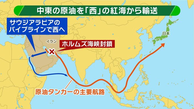 ▼サウジアラビアの『パイプライン』を利用して紅海から迂回するルート