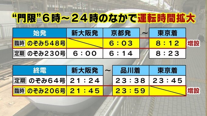 また、新幹線の始発と終電の時間にも変化があります。新幹線は6時から24時までの“門限”の中で運行していますが、この時間内で運転時間が拡大することとなりました。