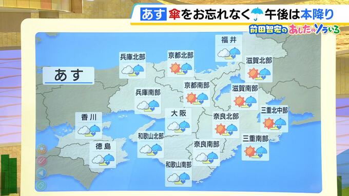 【近畿の天気】18日(水)は天気下り坂 午後は桜の成長を促す恵みの雨に 出かけるときは傘を忘れずに 2026年3月17日(火) 20:01 国内 天気 3月18日(水)の近畿地方は、天気が下り坂。出かけるときは雨具を忘れずにお持ちください。 朝のうちはまだ晴れ間の出る所もありますが、西から前線や低気圧が近づき、昼ごろからは雨の降りだす所が多いでしょ…