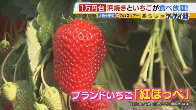 歩いて少しおなかをすかせたら、バスは最後のお楽しみ、いちご狩りへ。この日はブランドいちご、「紅ほっぺ」が食べられました(※日によって食べられるいちごは変わります)。