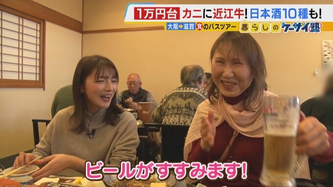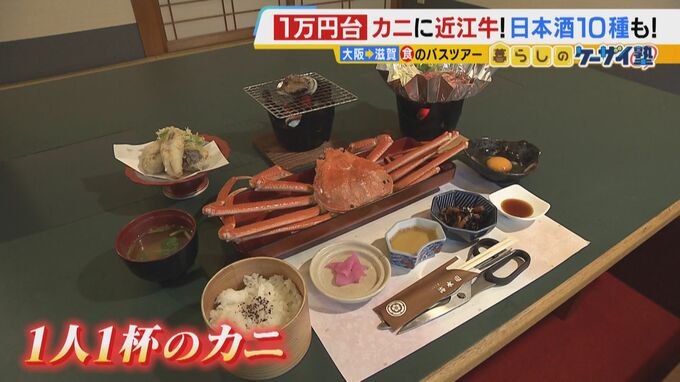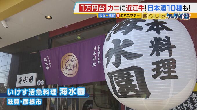 今回のツアーの目玉は、「いけす活魚料理 海水園」の豪華会席料理です。カニは贅沢に、1人1杯!アワビにフグ、さらには近江牛のすき焼きまで勢ぞろいです。