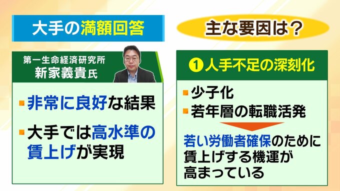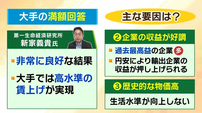 大手の「満額回答」について、第一生命経済研究所・新家義貴氏は「非常に良好な結果」「大手では高水準の賃上げが実現」と評価。主に3つの要因が考えられると言います。