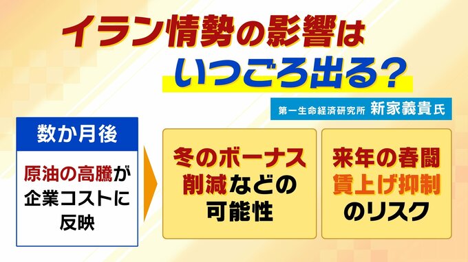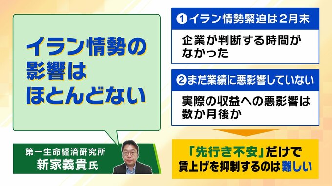 今回の春闘に「イラン情勢の影響はほとんどない」と新家氏は指摘。情勢が緊迫し始めたのは2月末で「企業が判断する時間がなかった」ということです。また、収益に悪影響が及ぶとすれば数か月先になると言います。