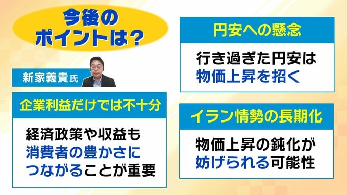 今後のポイントについて、「企業利益だけでは不十分」と新家氏は指摘。「経済政策や収益も、消費者の豊かさにつながることが重要」と言います。