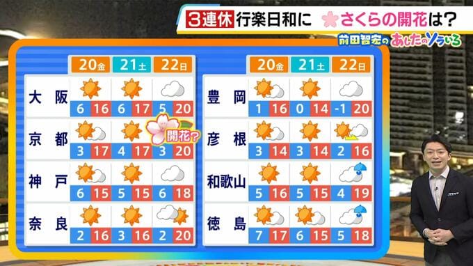 【近畿の天気】20日(金・祝)春分の日は穏やかな行楽日和 春のやっかい者の花粉や黄砂、寒暖差には要注意 2026年3月19日(木) 19:36 国内 天気 3月20日(金・祝)春分の日の近畿地方は、穏やかに晴れて日ざしが温かいでしょう。ただ一日の寒暖差は大きい見込みです。 高気圧に覆われて、近畿地方は全域で概ね晴れるでしょう。薄雲を中心に多少雲が広がる…