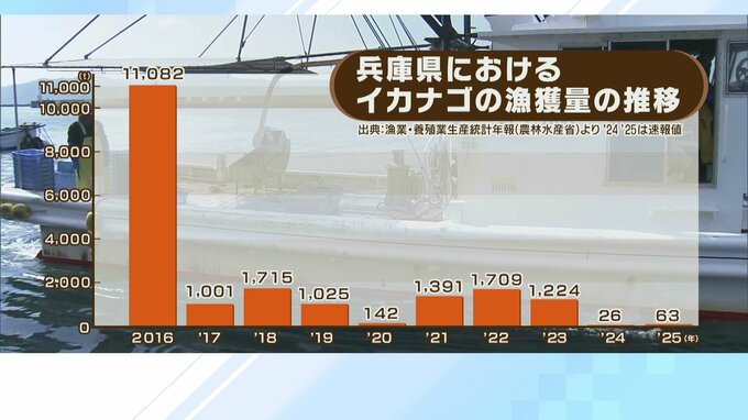 「兵庫県におけるイカナゴの漁獲量の推移」(出典:漁業・養殖業生産統計年報(農林水産省)より)を見ると、2016年には1万tを超えていたものが、翌年には1000t台になり、ここ3年間は、さらにグッと減っているのがわかります。