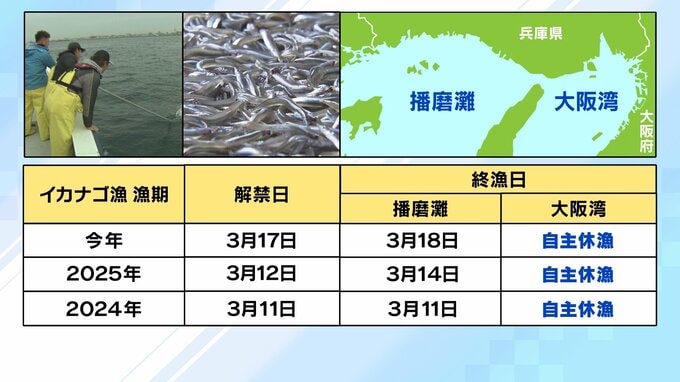 イカナゴは獲れる量が年々減少していて、全部獲ってしまうと翌年以降の資源がなくなってくるという問題もあるため、資源を守るために漁期を制限しているということです。