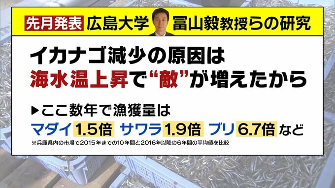 2月に発表された広島大学・富山毅教授らの研究によると、イカナゴ減少の原因は、「地球温暖化などによる海水温の上昇で、イカナゴの“敵”が増えたから」ではないかということです。