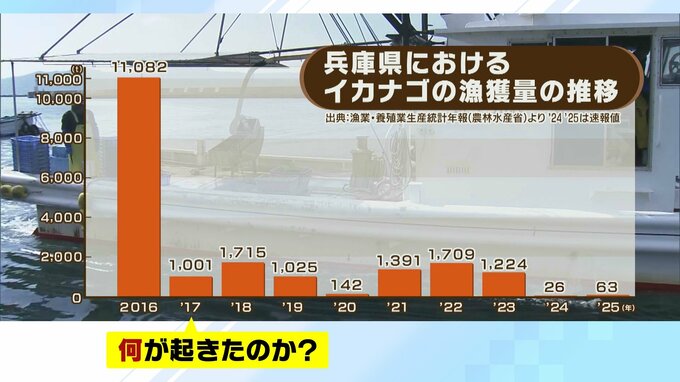 “敵”というのは、イカナゴを捕食する魚が増えたのではないかということで、ここ数年の漁獲量は、マダイ1.5倍、サワラ1.9倍、ブリ6.7倍に増えているということです。