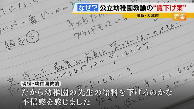 (現役・幼稚園教諭)「大津市として就学前の教育を大事に思っていないのかな。だから幼稚園の先生の給料を下げるのかな。不信感を抱きました」