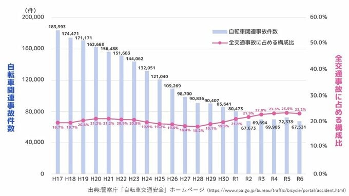 なぜ自転車にも青切符導入?背景には自転車めぐる交通事故の推移