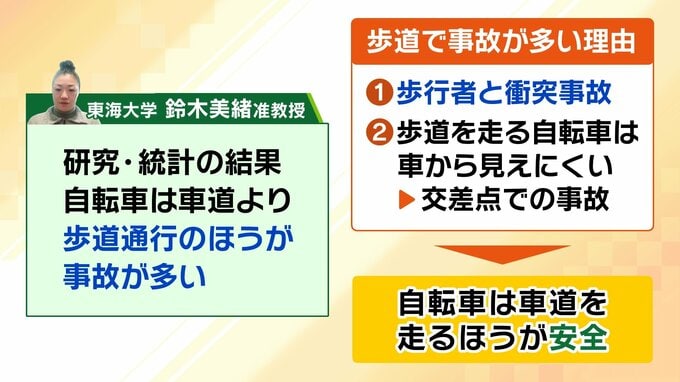 交通工学や交通計画が専門の東海大学・鈴木美緒准教授によると、研究や統計の結果、事故にあう自転車は、車道よりも歩道走行している場合が多いというのです。