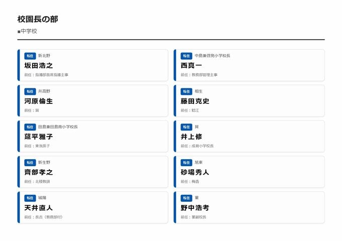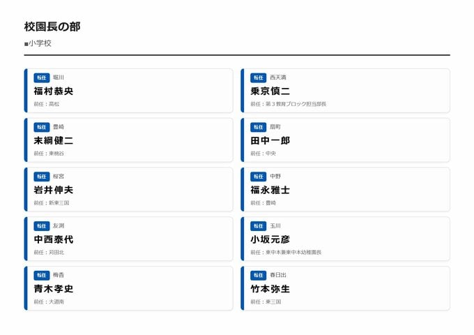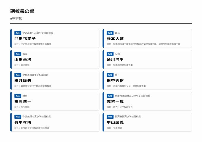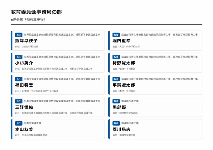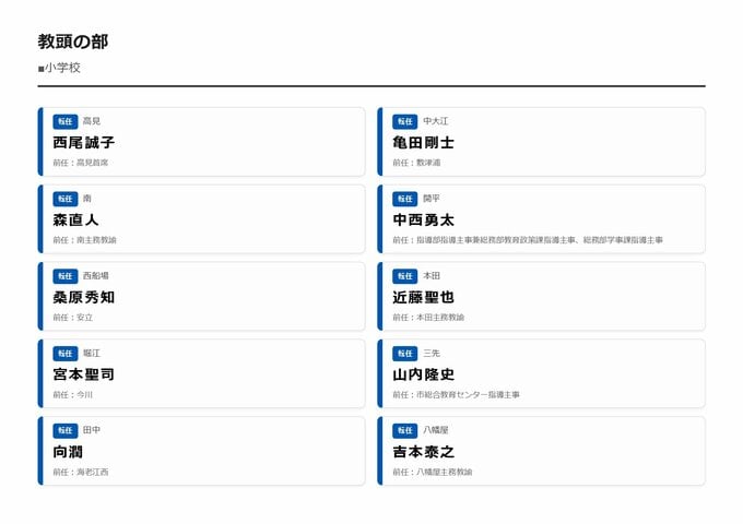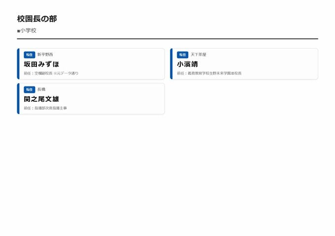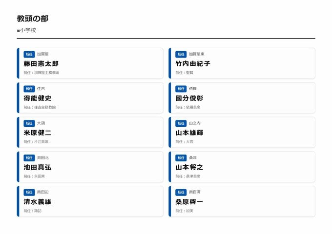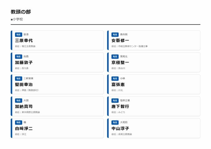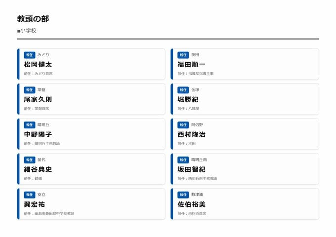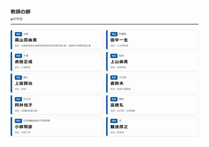 MBS編集部セレクト 【大阪市・教職員人事異動2026】校長、教頭先生などの新任・転任「あの先生どこ行ったん?」全掲載(小学校、中学校、義務教育学校、教育委員会など) 2026年3月30日(月) 16:11 国内