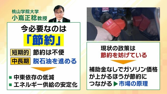 また、市場原理の観点から「補助金なしでガソリン価格が上がる方が節約につながる」と指摘。「現状の政策は節約を妨げている」と述べています。