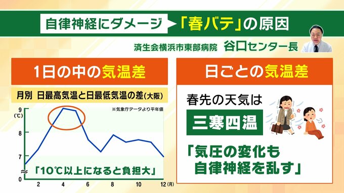 1日の中の気温差が大きい春。「三寒四温」と言われるように、日ごとの気温差が大きく、気圧の変化も自律神経を乱すということです。ほかにも、春ならではの原因として、谷口氏は「花粉症」「生活の変化」を挙げています。